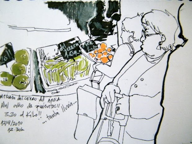 Hace un rato estuve dibujando en el mercado de al lado de mi casa, en Sevilla. Voy a ir más veces porque es todo un espectáculo. Ha sido un mal año de pimientos y están carísimos, pero los calabacines están a solo un euro el kilo. Y la mar de buenos.