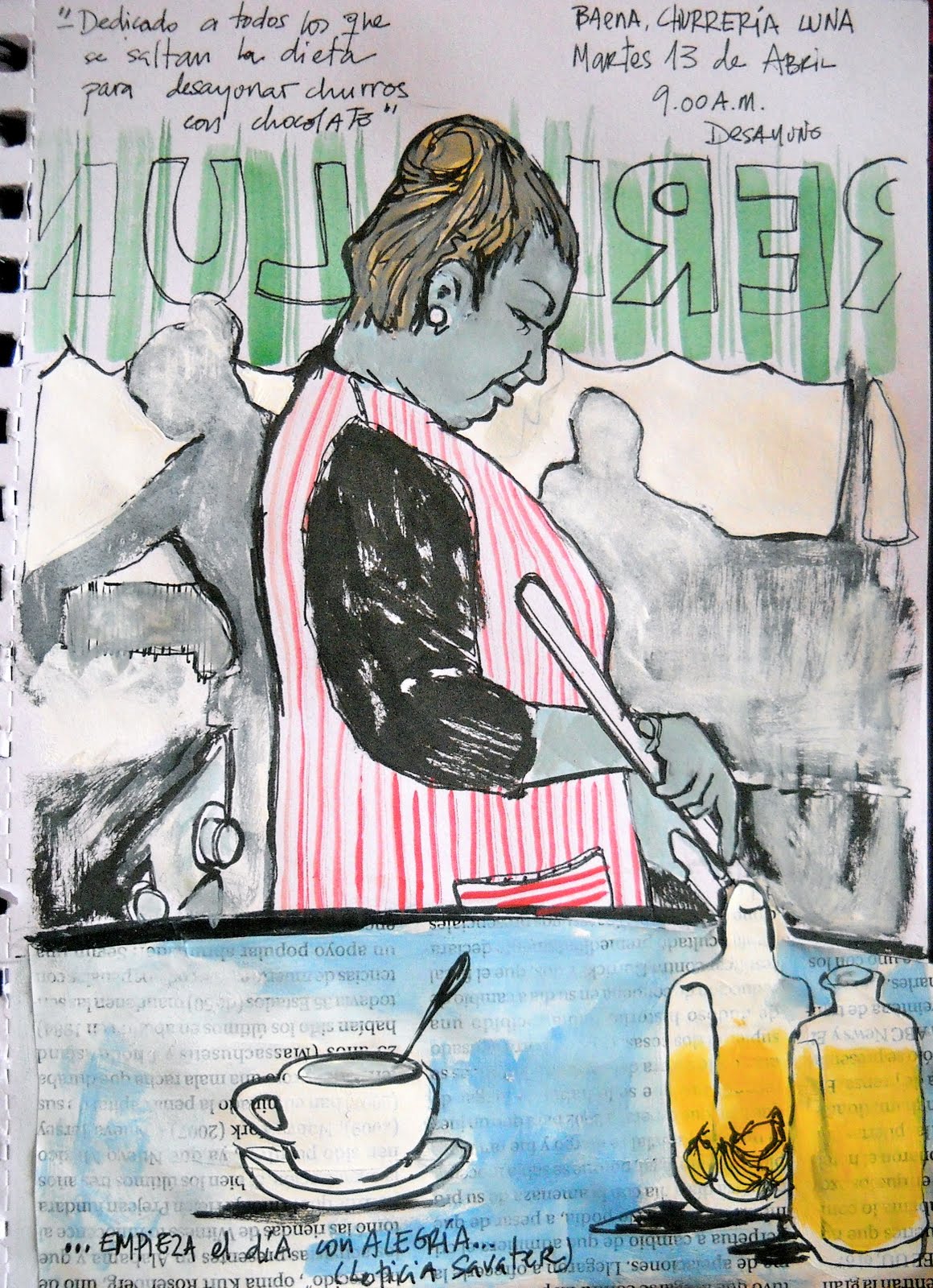 Este es mi homenaje a todo aquel que se salta la dieta y desayuna churros con chocolate para soportar un día largo de paciencia y trabajo. Esta mañana hice lo propio. Os dejo un dibujo testigo del momento.