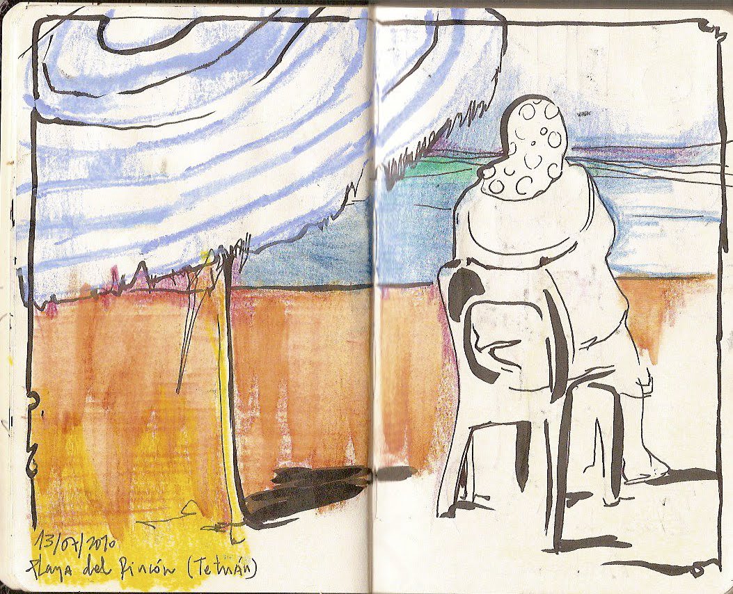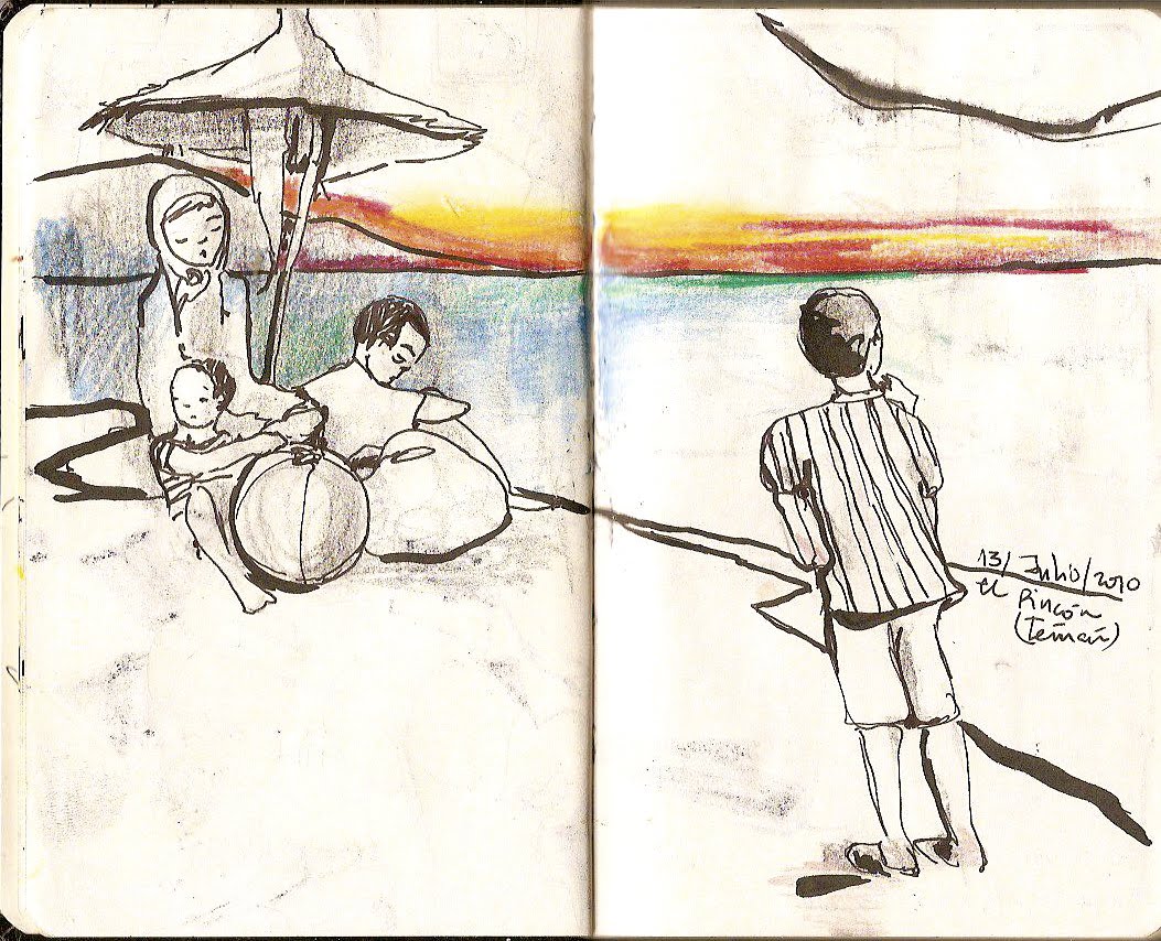 … me entretuve dibujando entre algunos otros sitios la playa del Rincón, llenita de gente cuando llegamos… pero casi vacía al final del día.