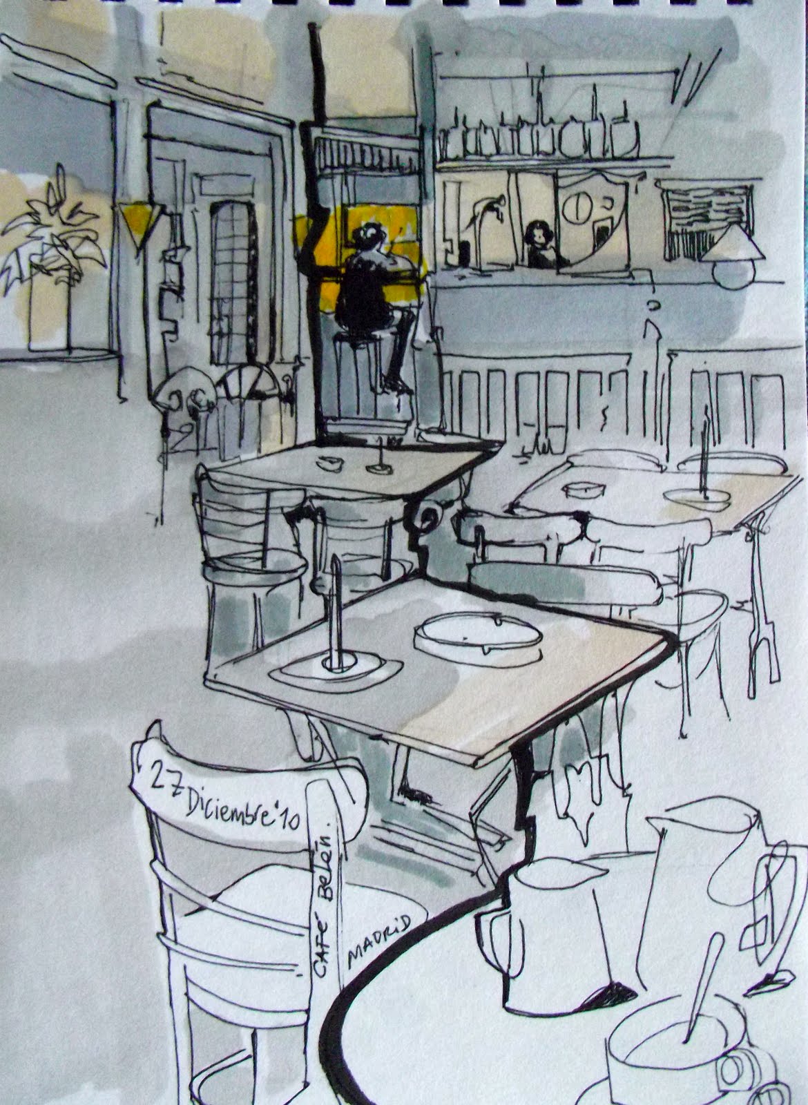 He pasado estos días en Madrid, con la familia… Para una sureña como yo hacía mucho, mucho frío… Buscando la adaptación al medio he dibujado en interiores. Aquí un ejemplo: el café Belén en la calle del mismo nombre. Poca vida dentro.