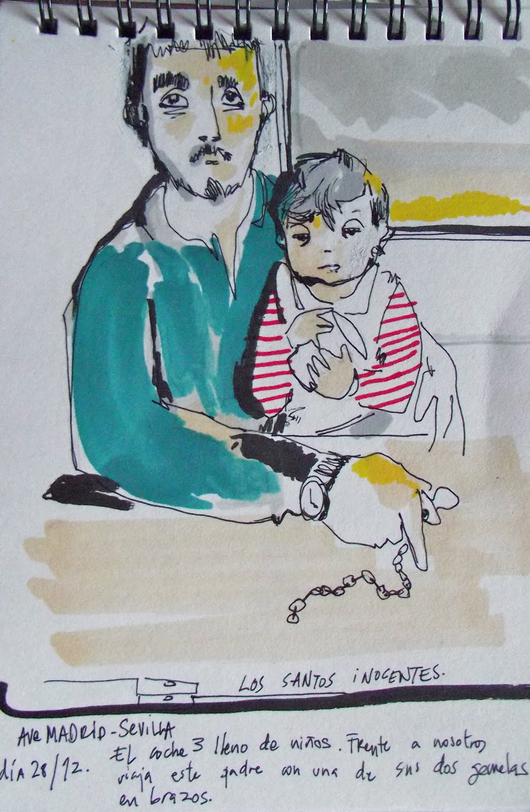 En el tren se puede dibujar casi de todo. Una suerte para mí tener hoy como compañeros de viaje a este padre con sus dos hijas gemelas de aproximadamente año y medio de edad. Dificilmete pararon un rato quietas. El padre, con paciencia infinita, fue capaz hasta de darles de comer y de dormirlas. Yo mientras tanto intenté retratarlos a los tres.