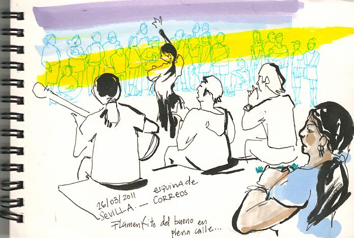 Ayer por la mañana paseando por el centro de Sevilla encontramos este tablao en plena calle. Empezar el día escuchando un poquito de flamenco por alegrías y tangos deja la cabeza despejada y ese puntito de buen rollo por dentro que te invita a ser mejor persona. Este dibujo para los buenos flamencos.