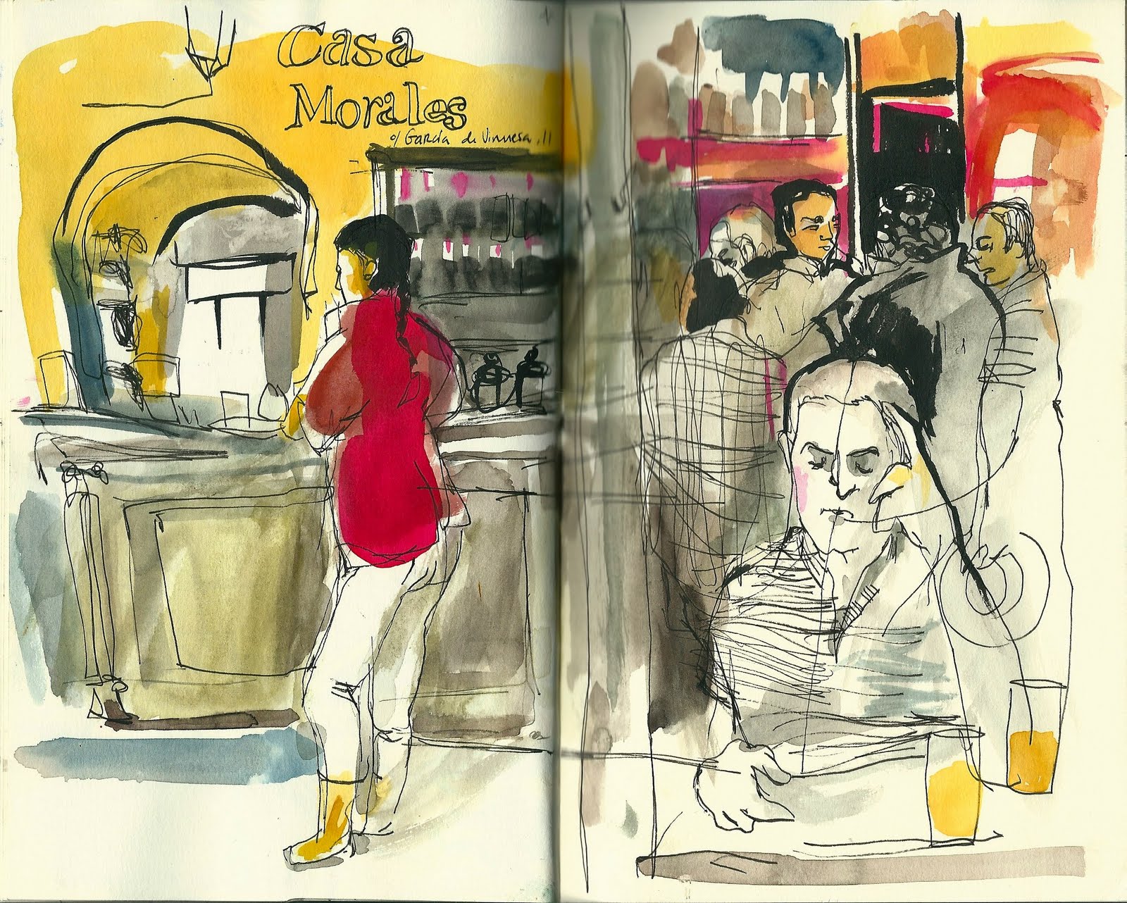 Sobre la percepción del espacio, por ejemplo, al hilo de los dos dibujos del A Brasileira… el mismo espacio sereno, semivacío y con un fuerte contraluz matutino se percibe de una forma totalmente distinta de noche, lleno y animado. La mirada se dirige hacia fuera en el primer caso mientras que se posa en lo que sucede dentro por la noche. O no, Luis, déjate de pajas mentales, si hubiéramos intercambiado las horas habríamos dibujado de igual manera… 😉