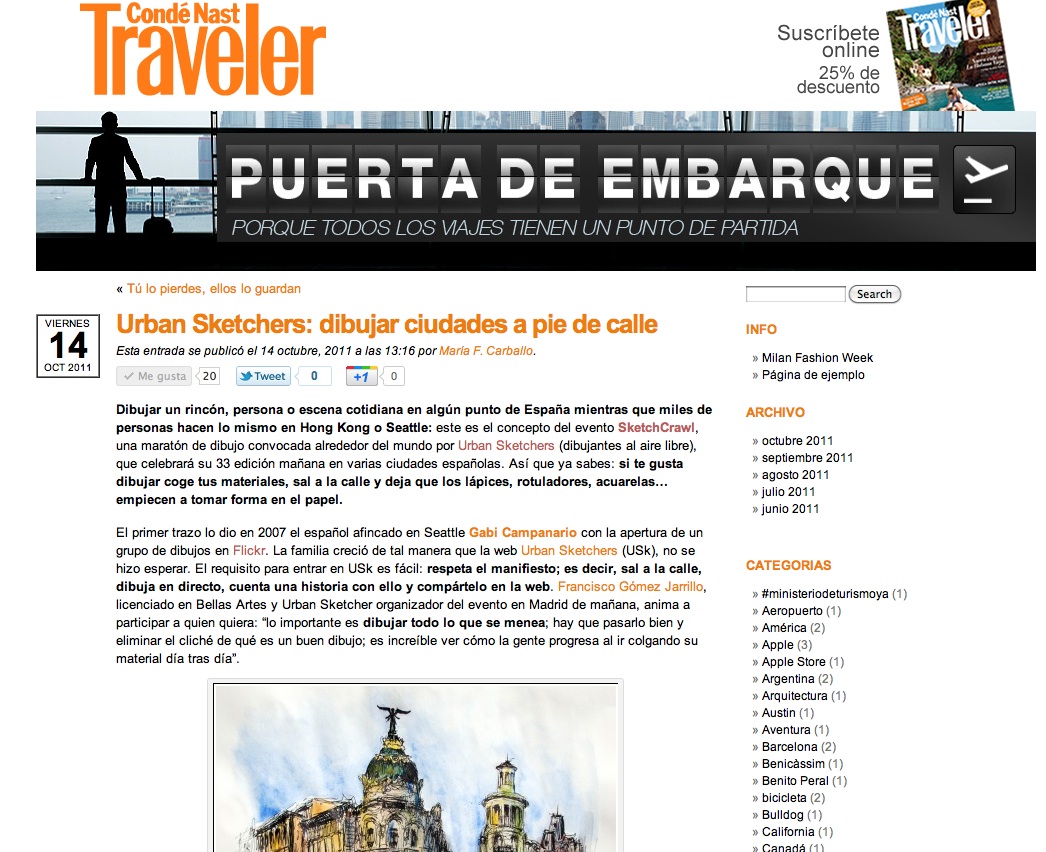La revista digital Condé Nast Traveler publica un artículo firmado por María F. Carballo sobre Urban Sketchers Spain, en el que pongo mi careto y mi granillo de arena.