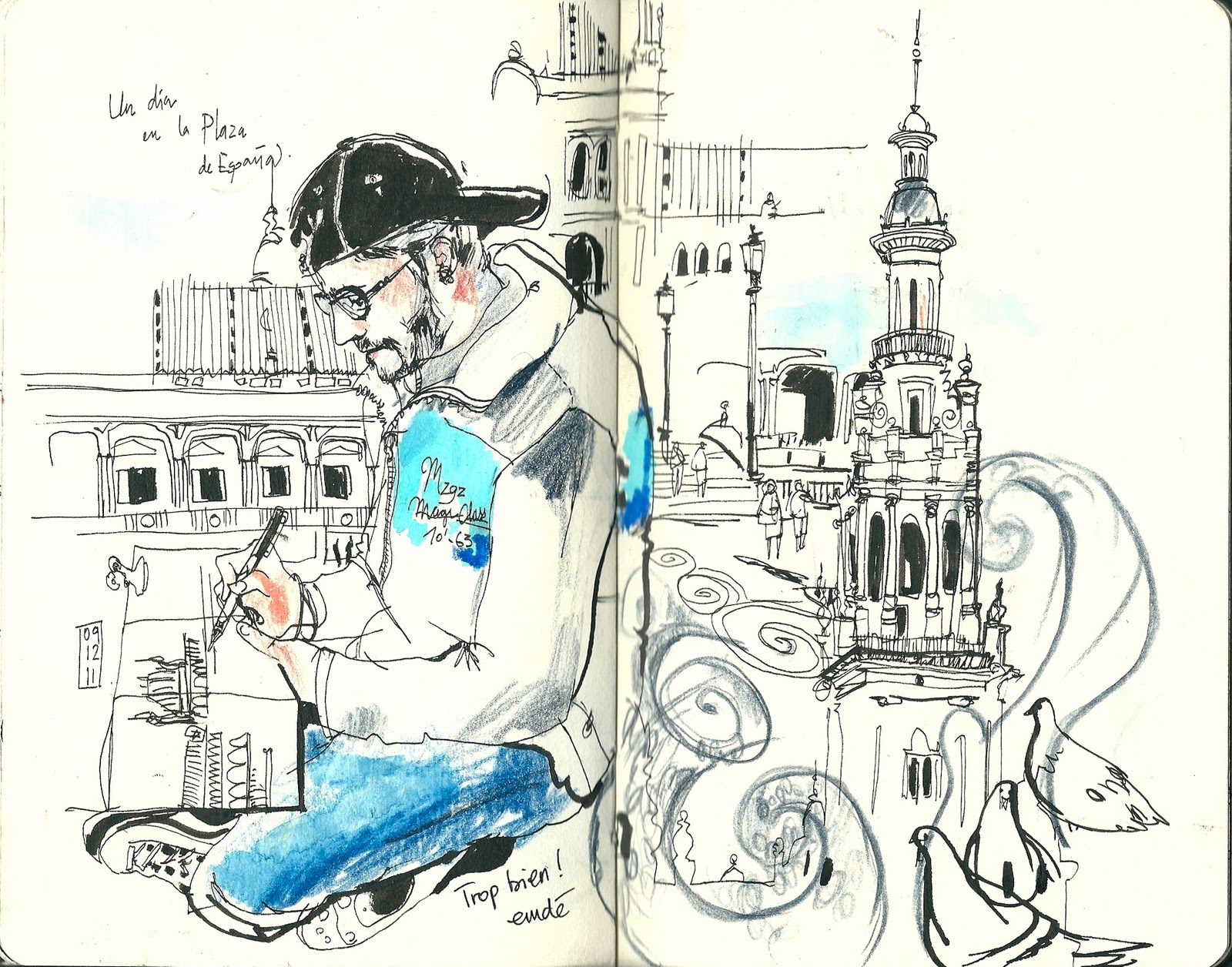 He tenido la suerte de que el supergenial emdé ha estado dibujando su panorama de la Plaza de España de Sevilla. Así que me he enganchado a él toda la tarde como una lapa, a ver si se me pega algo…