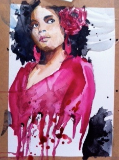 ¡ Pero qué fuerza tiene este retrato, Inma ! No se si me gusta más el tono de la piel que tanto te ha costado sacar, los churretones de acuarela cayendo, las gotas secas de color de fondo, el gesto del cuerpo, el movimiento en contrapicado de la cabeza o el detalle verde junto a la flor. Me encanta todo, definitivamente.