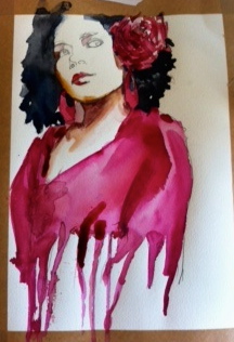 ¡ Pero qué fuerza tiene este retrato, Inma ! No se si me gusta más el tono de la piel que tanto te ha costado sacar, los churretones de acuarela cayendo, las gotas secas de color de fondo, el gesto del cuerpo, el movimiento en contrapicado de la cabeza o el detalle verde junto a la flor. Me encanta todo, definitivamente.